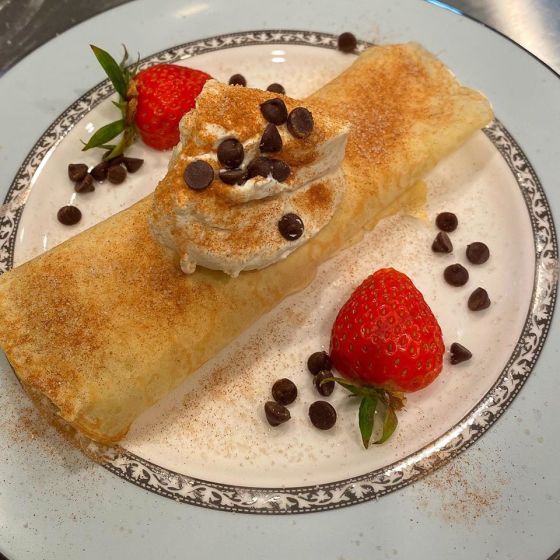 Vanilla cream cheese crepes topped with cinnamon whipped cream