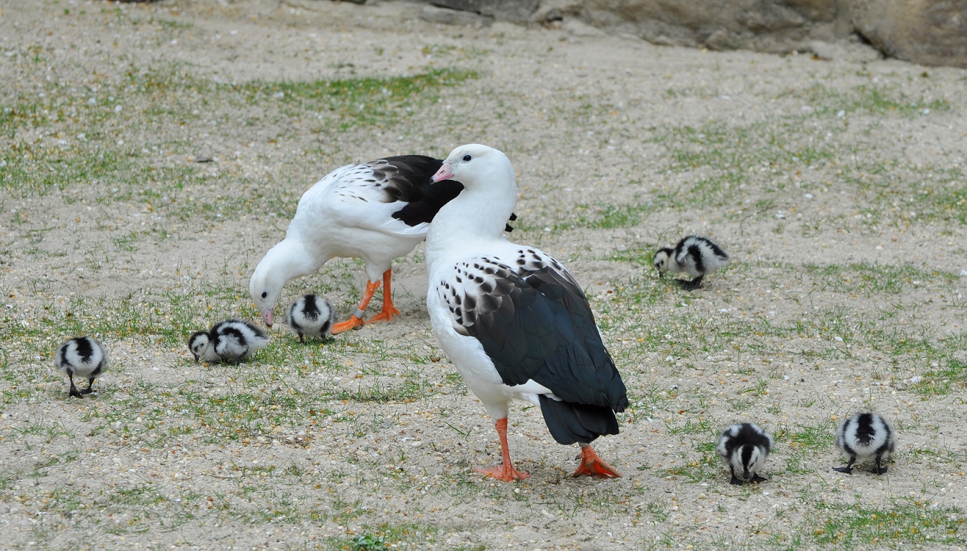 April was a busy month at the Zoo, including the hatching of six Andean geese in the Zoo’s Bird Valley. Andean geese sport spectacular skunk-like black and white feathering at hatching, with pink feet and a short pink bill. Ready to go almost at hatching, the goslings scurry about at high speed under the protective eyes of their parents. Naturally herbivores, Andean geese have been called “cows with feathers”. Native to the Andes Mountains of Chile, Bolivia, Argentina and Peru, they are primarily terrestrial, spending more time on land than in the water. Listed as Least Concern in the wild by the International Union for Conservation of Nature (IUCN), this species is relatively well protected from human encroachment due to inaccessibility, but unregulated hunting of geese and collection of eggs does impact local populations.