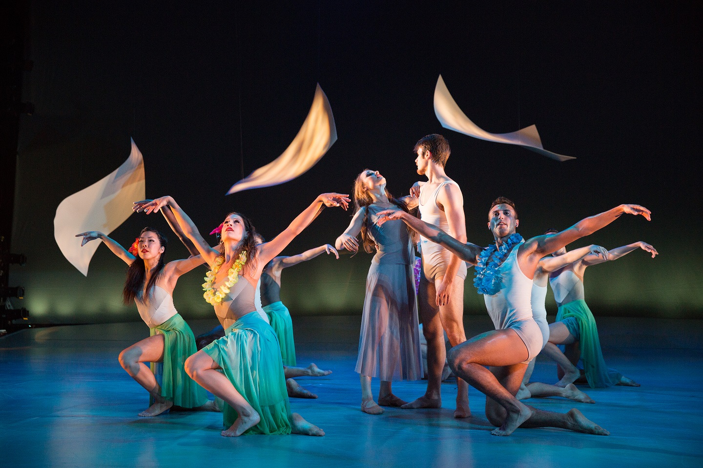 A story of love, loss and adventure, “Sunset” combines contemporary ballet with original music, played live onstage by a cabaret band on original instruments invented by Neil Feather. It was choreographed by Matthew Neenan and composed by Rosie Langabeer, Andrew Mars, Josh Machiz and Isaac Stanford, immersing audiences in the world of the South Pacific by weaving together original 1930s-inspired songs, field tapes and archival recordings. The work features set design by Maiko Matsushima, lighting design by Drew Billiau, costume design by Christine Darch and sound design by Nick Kourtides.
