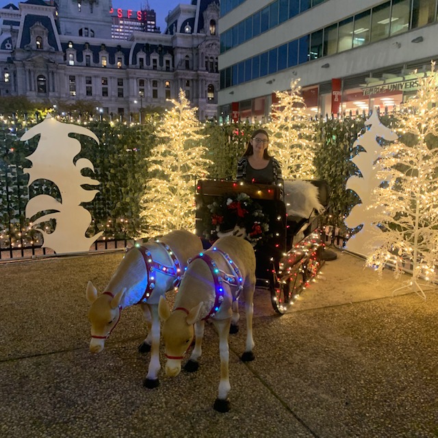 There are festive photo ops and decorations at every turn! Christmas trees, Santa’s sleigh with City Hall as the backdrop, delightful red, white and green pods where you can cozy up with your friends and family as you sip some hot cider! Even the food is gooey and delicious- like the mac and cheese balls, blue cheese burgers with bacon, and chicken cheese steaks. Mmm.