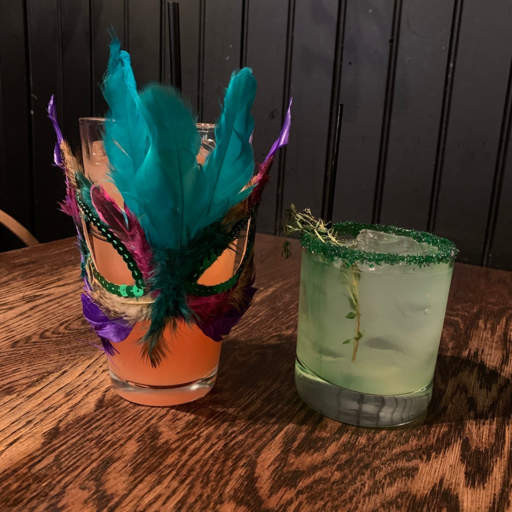 First up- a round of drinks! My first trip to New Orlean’s included a beeline right to Pat O’Brien’s for a classic New Orleans rum drink, The Hurricane! Of course, you can get that here too and it comes with a mask! Kait got the smudge kit margarita!