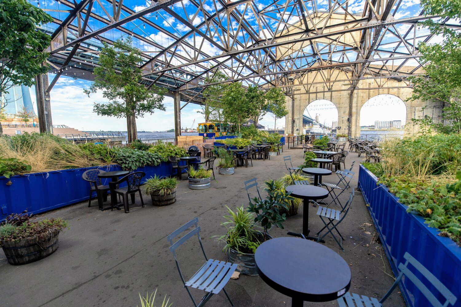 The Garden is located on the water-facing side of Cherry Street Pier passed the open pods, local art and other small businesses. Once at the end of Cherry Street Pier, guests are greeted with open industrial ceilings allowing fresh air, warm sunshine and a welcoming waterfront breeze. Seating is first-to-come first-to-serve, with a mixture of picnic tables, cafe tables, and bar height seating with multicolored chairs and aesthetics. Seating inside The Garden offers several picturesque options, including seating facing the gardens and trees, seating with views of the Benjamin Franklin, and more private tucked away seating with perfect views of the water and adjacent boats just feet away in the river. All seating is shaded from the natural historic structure which currently exists that blends together raw and rough elements, including concrete and stone, iron beams, and historic details.
