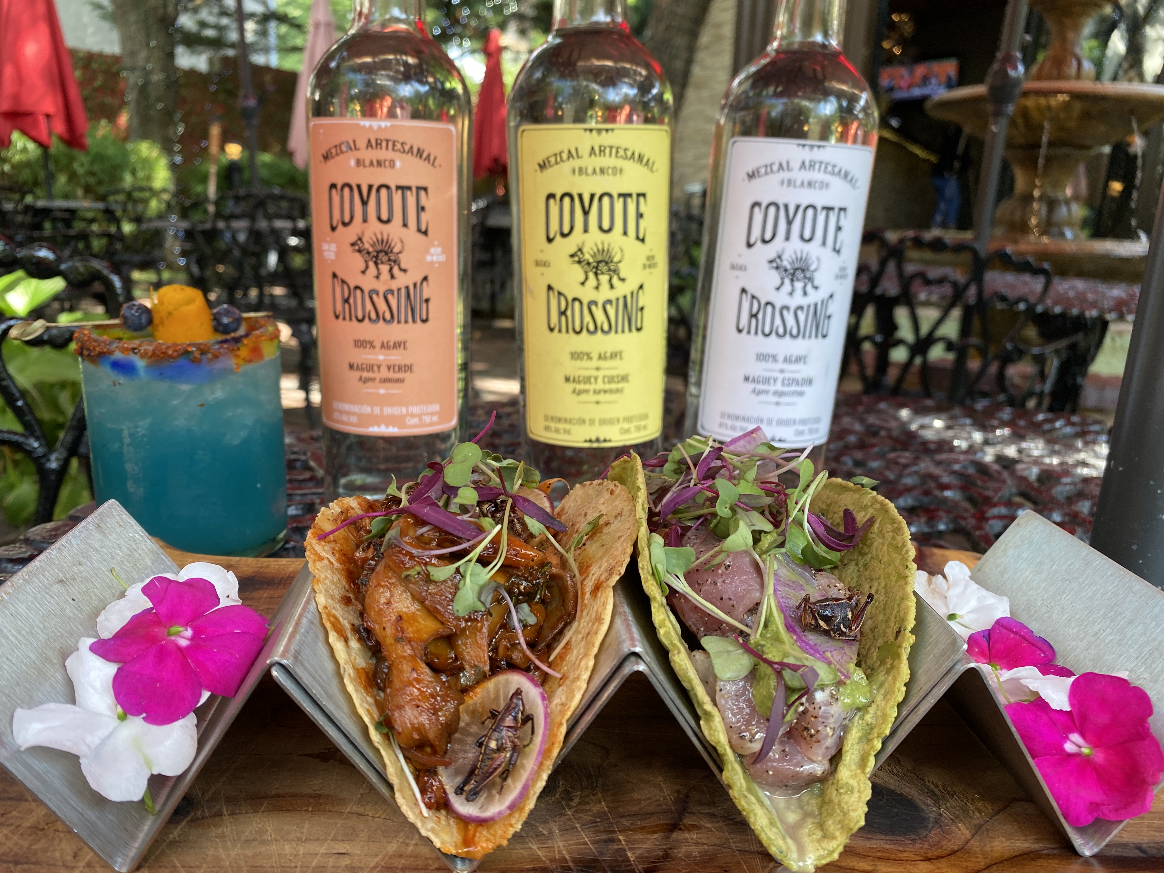 Included in the specials are tacos served on tortillas made from cricket flour, which is produced by Querétaro, Mexico-based Griyum, whose mission is to develop new proteins to combat malnutrition and provide better economic opportunities to farmers in underserved communities throughout Mexico and South America. These tortillas are available for any of the (11) taco options on Coyote Crossing’s menu. Additionally, Co-owner and Executive Chef Christopher Hora will be rolling out whole cricket dishes in the coming months. An anniversary dish of Saffron Marinate Foie Gras Memela has been added to the menu, featuring organic, locally-sourced masa blanco, seared foie gras, salsa macha con pasas, ajo, guajillo, amaretto, Gran Marnier, sesame, and frijoles tamarindo ($32).