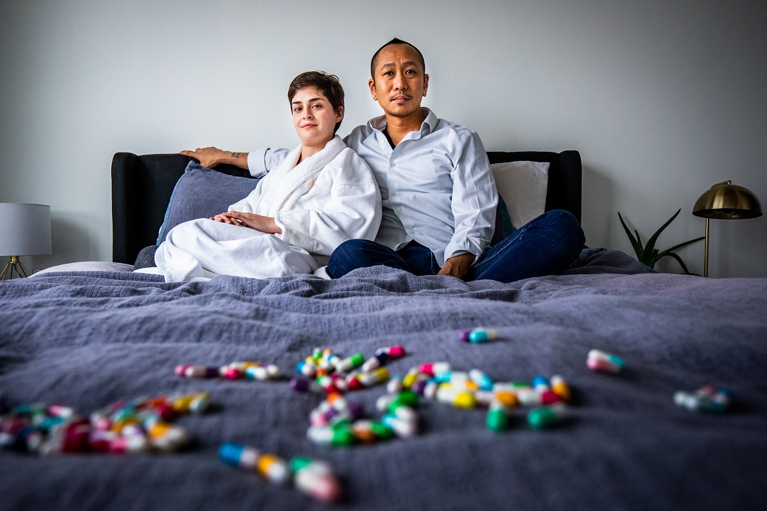 The couple at the center of the story, known as Her and Him, are played by Claire Inie-Richards and Makoto Hirano. They are joined by Matteo Scammell as pharmaceutical sales rep Joe and Him’s bro-ish friend Matty D. Inie-Richards is making her PTC debut. She is a company member at People’s Light, and appeared in their Summer 2022 production of The Vinegar Tree. Hirano returns to PTC, after a recent appearance in Theatre Exile’s Wolf Play. Scammell returns to PTC after appearing in Sweat in 2018. He was also seen in Wolf Play at Theatre Exile and is currently in Charlotte’s Web at The Arden Theatre Company.