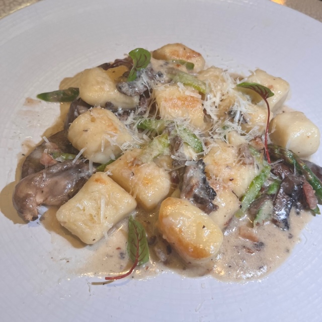 Potato Gnocchi – Mushrooms, Asparagus, Bacon Lardons, Fontina Cheese, Herbs