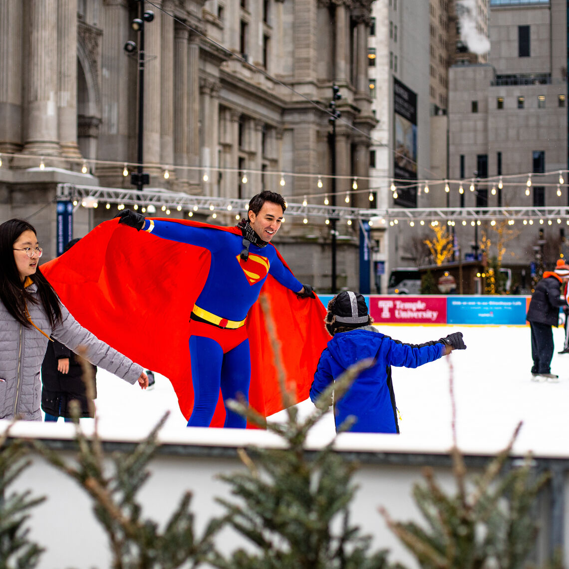 Also returning this month, Superhero Skate is back this Saturday, February 4. From 1:30 p.m.-3 p.m., families with valid Rothman Orthopaedics Ice Rink tickets are invited to skate with their favorite comic book characters, and costumes are encouraged! Complimentary capes will also be distributed to kids while supplies last. Inside at the Rothman Orthopaedics Cabin, enjoy face painting and fun crafts at no charge. As a reminder, Superhero Skate admission is not a part of the Free in February promotion.
