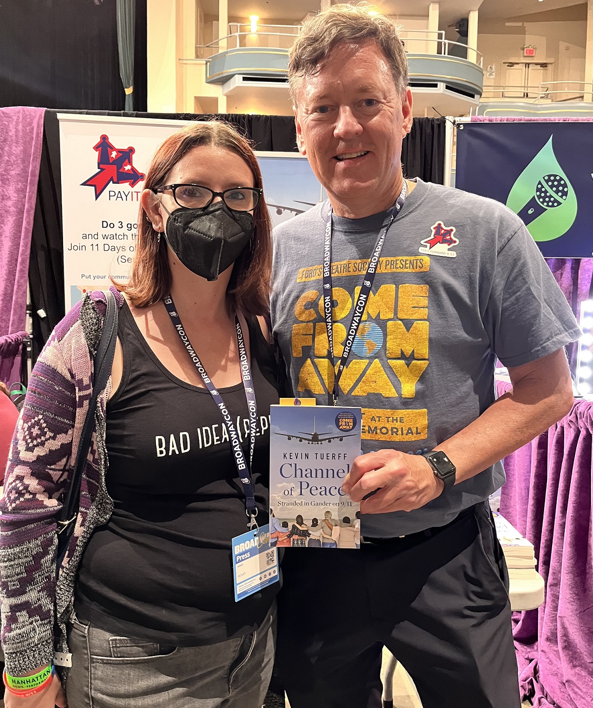 Kevin Tuerff was one of the thousands of people stranded in Gander, Newfoundland on September 11, 2001 after the terrorist attacks on our country forced many planes to be rerouted to the small Canadian town. When Tuerff returned to Gander on the 10th anniversary of 9/11, he met the husband/wife writing team of David Hein and Irene Sankoff who informed him that they were working on creating a musical based on the kindness Gander’s residents and the care that was provided for those 38 planes full of strangers from all over the world. Tuerff’s true story ended up inspiring one of the characters in the show and Come From Away became a Tony-winning hit Broadway musical that went on to tour all over the world. Tuerff decided he, too, wanted to tell the story of those days in Gander. I picked up his memoir, Channel of Peace: Stranded in Gander on 9/11, at BroadwayCon last summer and briefly talked to him about the show’s 2022-2023 season stop in Philadelphia.