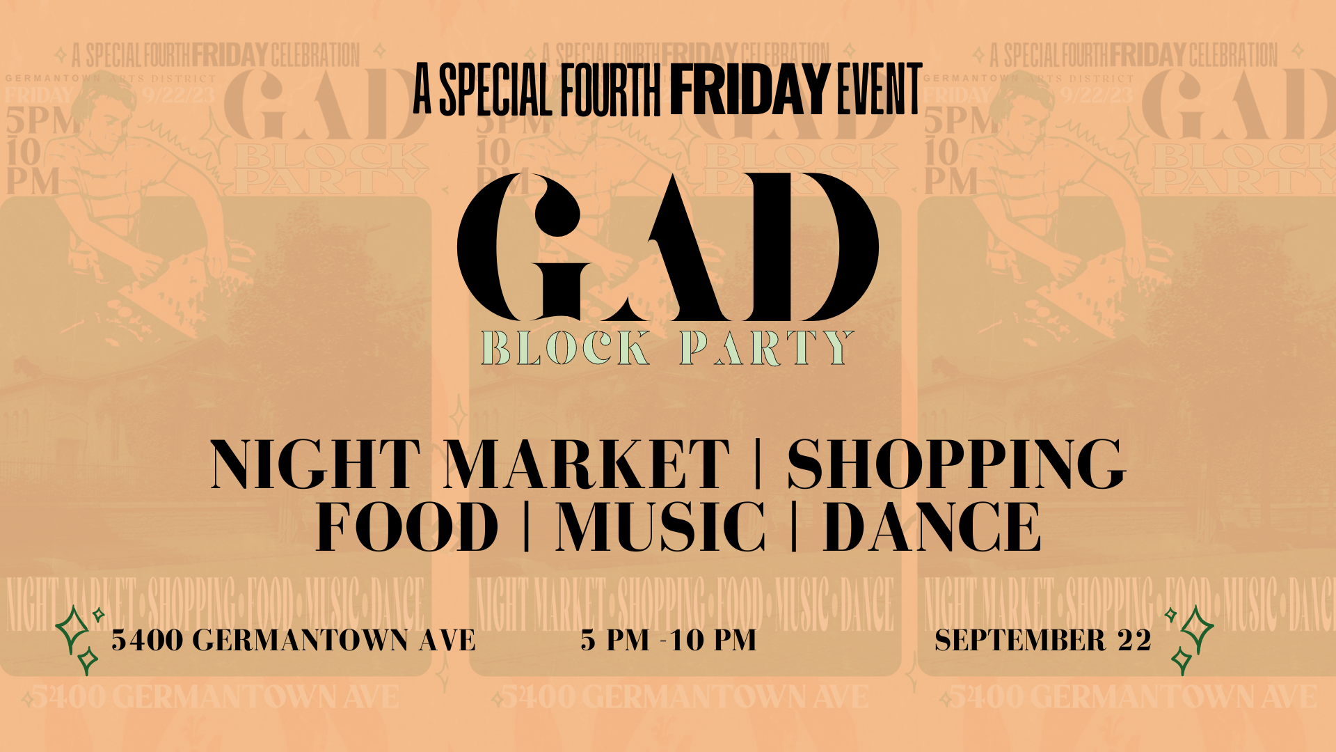 Art breeds culture, and culture thrives in Germantown. This has been the GAD motto since its conception in November 2022. Germantown has always been a hub of creative expression for many artists and musicians, and the GAD supports and contributes to this creative ecosystem by partnering and collaborating with local artists, arts-based organizations, and businesses. To do this, the Germantown Arts District has been proudly hosting monthly Fourth Friday-themed events that allow creatives in the community to showcase their talents and skills. In celebration of Germantown by the people of Germantown, the Germantown Arts District invites the Germantown community and Philadelphia area to attend their very first GAD Block Party on September 22, 2023, from 5:00 P.M. to 10:00 P.M.