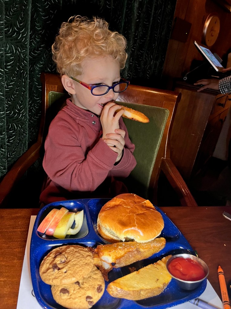 If you’re planning a family outing for Night Forms, the kids menu at Rat’s is adorable. There are four options priced at $13 each- chicken fingers, buttered pasta, cheeseburger or fried shrimp. The meal includes fruit, cookies, and milk or juice. This was a huge win for Rowan- he loves apple slices. And he discovered popovers which were brought to our table to enjoy before the meal. We’ll be making those at home during the holiday break!