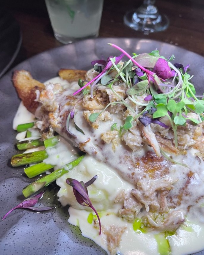 And this stripped bass is one of the best dishes I’ve had recently. It’s served on a bed of mashed potatoes and asparagus, with crab meat and covered in a lemon butter garlic sauce.