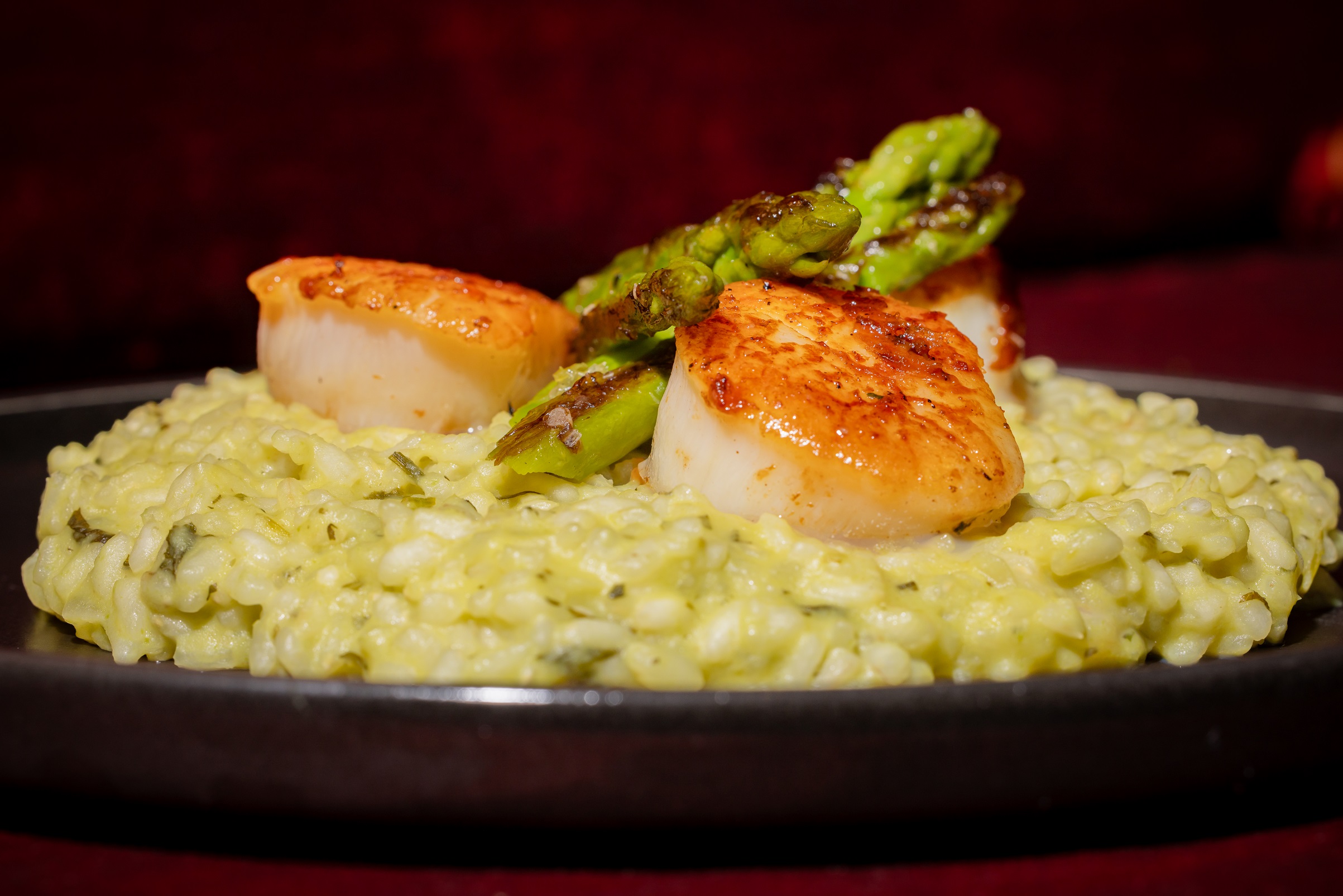 Asparagus and Scallops Risotto– Creamy risotto, asparagus puree, seared scallops and crispy prosciutto.