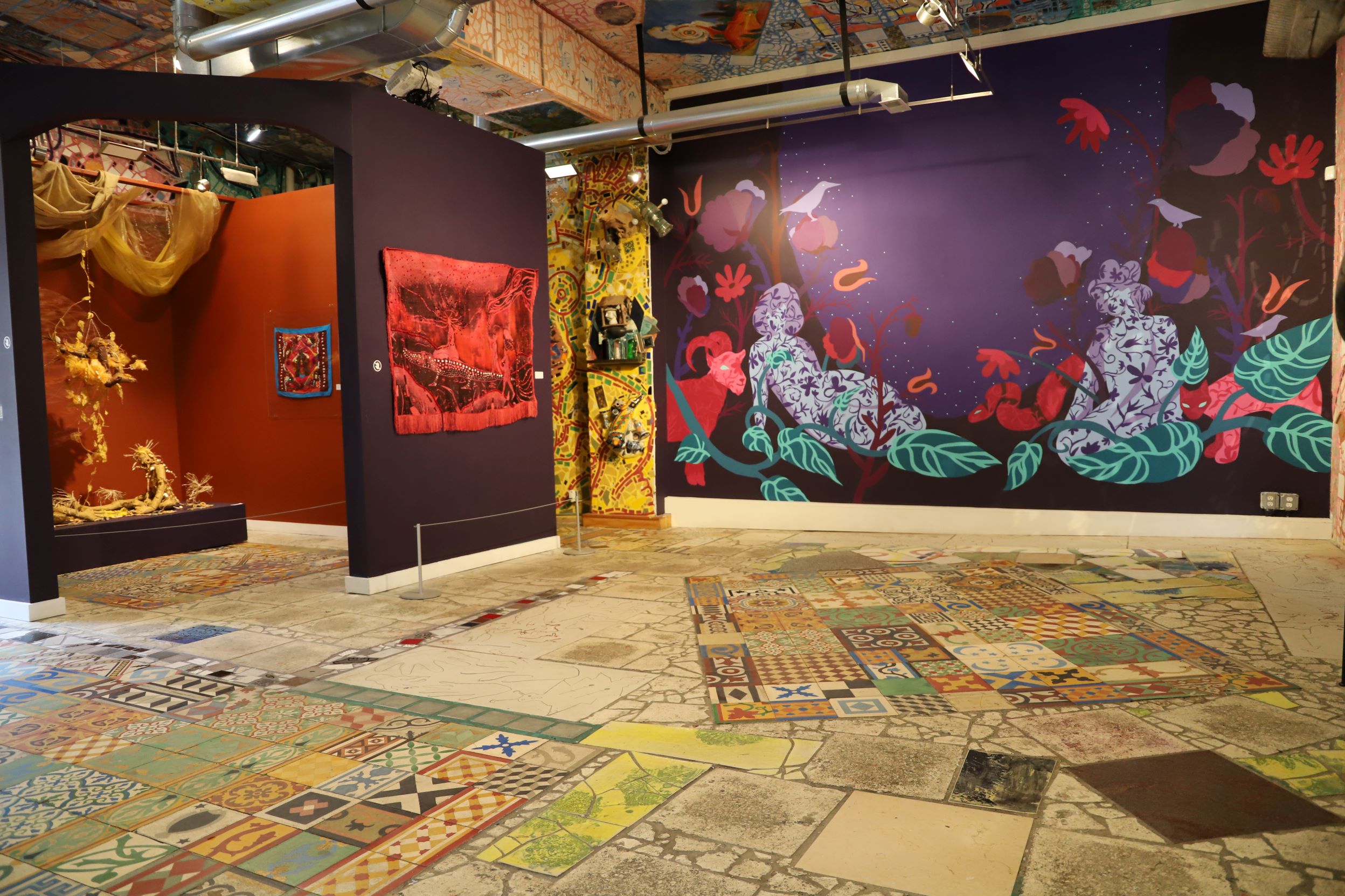 The mixed media works featured in After the Flowers Pass incorporate various weaving, dyeing, and beading techniques, allowing Khadar to build vibrant compositions combining human figures and their environments into one cohesive entity. They employ a sewing technique called Appliqué, in which fabric patches are layered on a foundation and then sewn in place by hand or machine with decorative stitching. Khadar also utilizes Digital Weaving to convert their drawings, mixed media sketches, and paintings into digital files suitable for weaving into textiles. Their process includes digital design software and automated looms to produce woven textiles directly from digital designs.