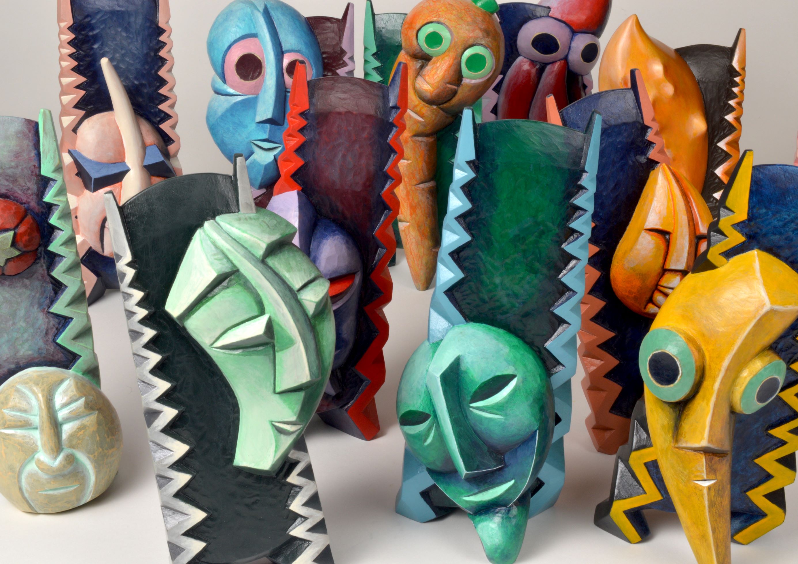 Similarly, the artist developed a series titled “The Pawns,” which were modeled after chess pieces and created in different scales to represent a family. These figures represent the first generation of immigrants who came from adversity but found opportunity in America. Another series in the exhibition, “Family Tree,” comprises a grouping of 14 hand-carved and painted faces made from yellow cedar. Sfirri sets each of the unique faces against a detailed frame, creating an almost three-dimensional portrait and offering a more playful direction while clearly demonstrating his rigorous technique.